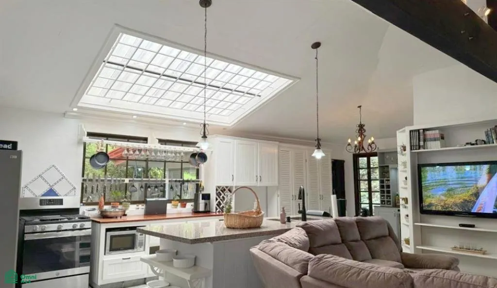 The house features a cozy yet spacious open design. There is a gas fireplace to give you great ambiance, you may need the fireplace place at certain times of the year! The kitchen is the center of the home and is French-inspired. With lots of counter space, plenty of storage, and pretty views you will enjoy everyday meals or entertaining your friends. Lots of windows, skylights, and high ceilings make this home very bright.