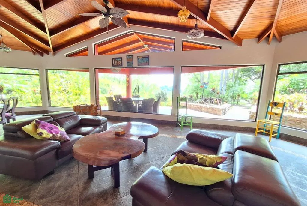 You will find this immaculate home just 10 minutes from downtown Atenas. The property spans 1.5 acres (6007 m2) of spectacular landscaped gardens, featuring exotic plants, fruit trees, and a serene atmosphere. It looks like every tropical plant/flower/bush that Costa Rica has can be found in this Garden of Eden. A large fishpond with a waterfall creates a soothing ambiance, while paved walkways meander through the property, perfect for strolling and taking in the natural beauty.