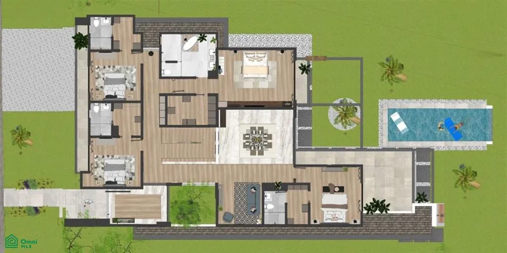 The architectural style of Tropical Bliss leans modern, with a mix of contemporary lines, warm materials, and subtle contrast. The entry opens to a double-height foyer, where light and volume immediately define the space. The home’s main social area unfolds in a spacious open-plan layout, connecting the living and dining rooms with the kitchen, which offers a functional central island. Soaring ceilings and expansive sliding glass doors amplify the sense of space and light, opening to a sun-drenched terrace with a BBQ area, bar, and landscaped garden.