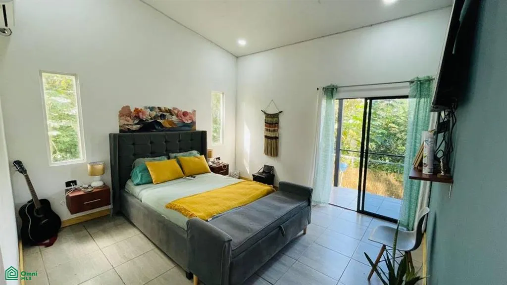 Master Bedroom: The bedroom features a generous walk-in closet, a private bathroom, and a private balcony overlooking the patio and pool.