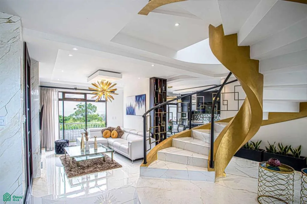 Artistic spiral staircase with golden finishes.