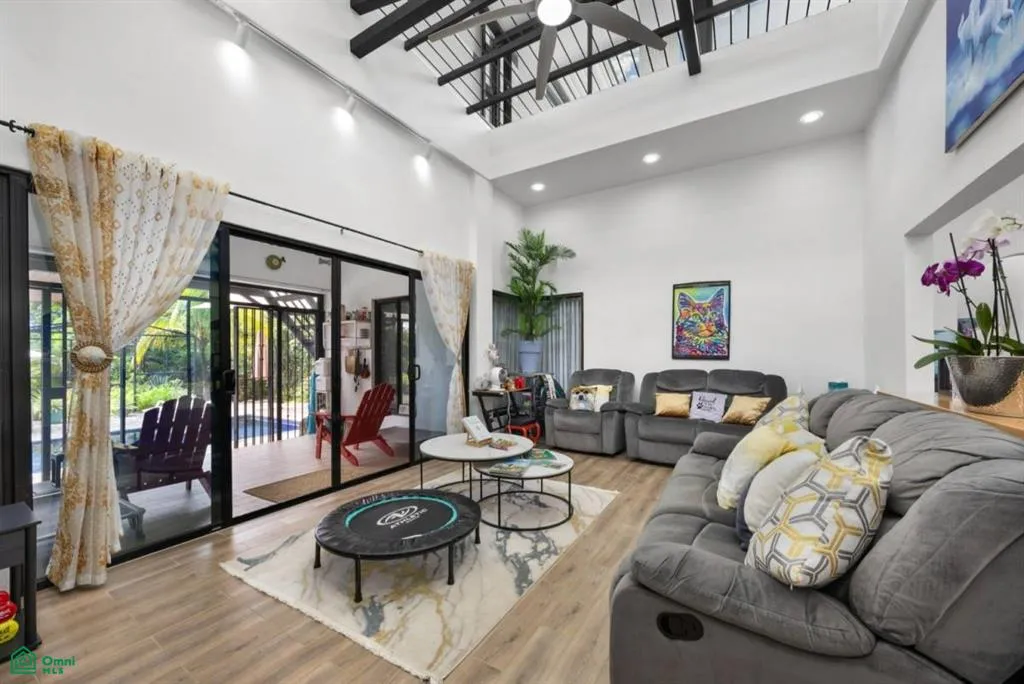 Inside the main residence, an open concept living space feels airy and uplifting. High ceilings with upper windows and wide glass sliders bring in natural light, creating a smooth transition to the outdoor terrace and pool. Warm wood look flooring enhances the fresh feel of the home, offering comfort with a modern style.