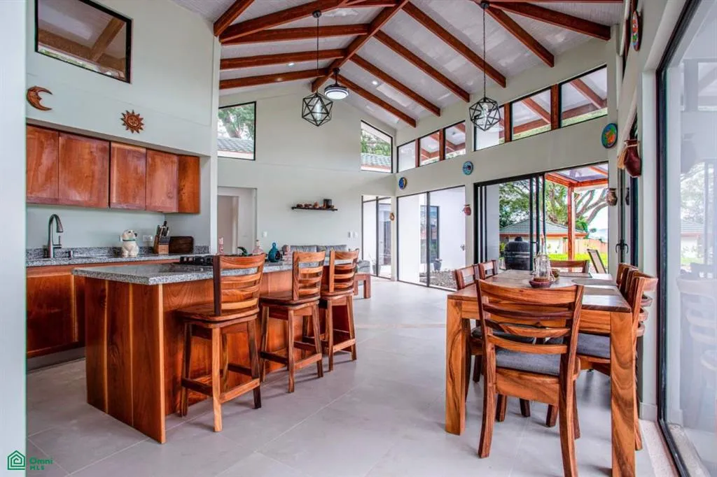 At the heart of the home is an open-concept living, dining, and kitchen area, designed to maximize natural light, cross ventilation, and visual connection to the surrounding landscape. High ceilings with exposed structural beams add architectural character while enhancing the sense of space and airflow.