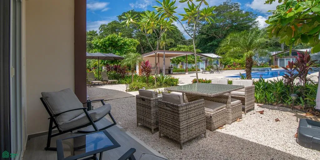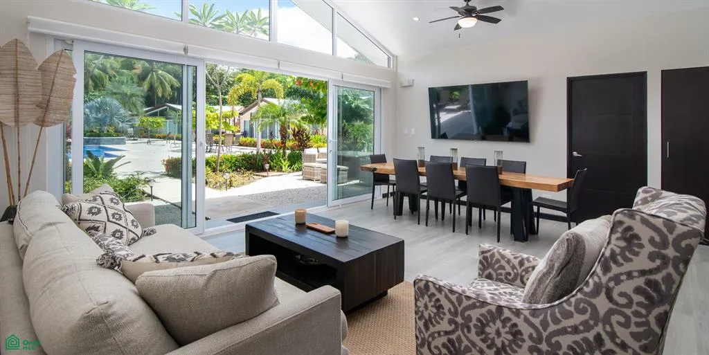 Inside the main residence, bright, open spaces and warm natural materials create an atmosphere that is both modern and inviting. At the center of the home, an open-concept living area seamlessly integrates the kitchen, dining, and lounge spaces. The modern kitchen features a large island that doubles as a breakfast bar and extra cooking surface, complemented by white cabinetry and high-end appliances. Floor-to-ceiling glass doors open fully to the outdoor terrace, allowing sunlight, tropical breezes, and views of the surrounding greenery and pool to fill the space. The terrace extends to the community pool for immediate outdoor leisure.