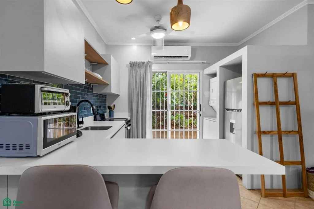 Ventola #2 is a tastefully updated 2 bed, 2 bath condominium located in the heart of Tamarindo directly across from Banco Nacional and within a short walking distance to the beach, shops, food, coffee, gyms, and more. No need for a car! This is a fantastic rental already making a great return and popular with guests for its shady tropical garden and newly refinished pool oasis and recently renovated kitchen and bath. Enter through a gated front veranda to the first level where you’ll find generous living, kitchen, and dining areas. Also on this level are the laundry, an updated full bathroom, owner’s storage and a back veranda, perfect for barbecuing and easy access to the pool. Upstairs, there are two bedrooms, both with built in storage and large windows for beautiful natural light. There is a shared full bathroom. All furnishings and linens are updated, kitchen is fully equipped. Call to schedule an appointment for viewing today.