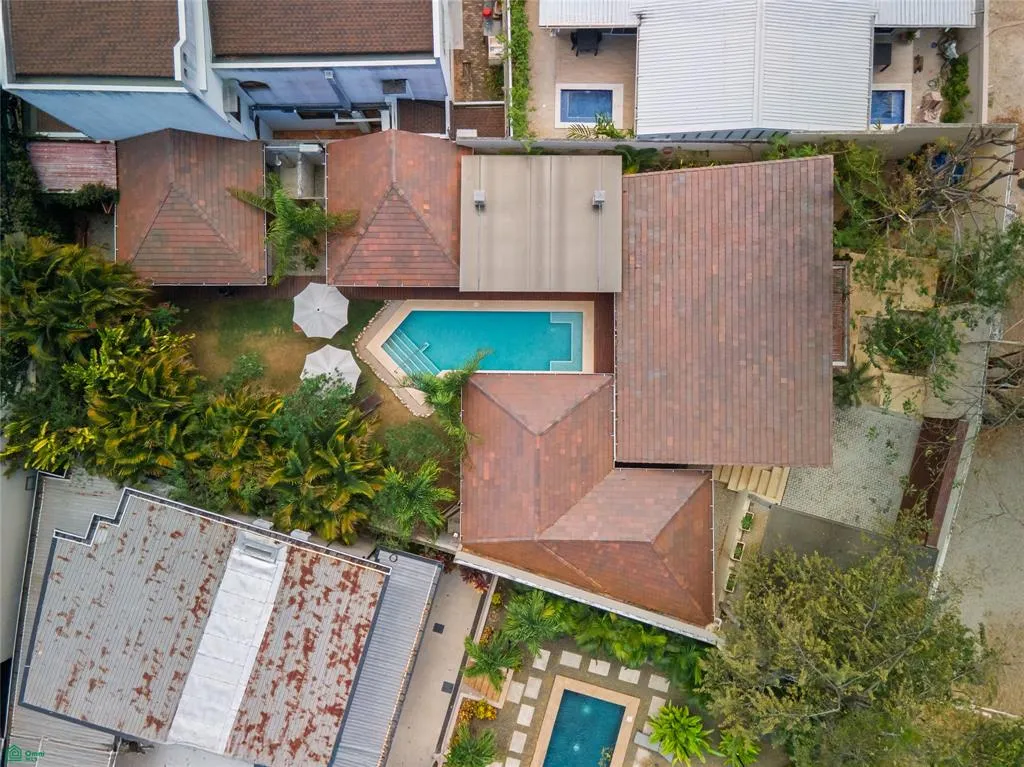 Outdoors, a lush walled garden surrounds a private swimming pool, teak-accented terrace, and outdoor cinema area, ideal for entertaining or unwinding in complete privacy. Floor-to-ceiling wood-framed doors connect the living spaces to the garden, while premium kitchen appliances, an oversized wood entry door, secure two-car parking , and twowater reserve tanks complete the home.