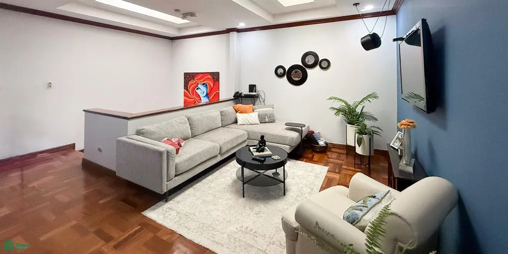Built on two levels, this property is distinguished by its generous spaces, functional layout, and excellent condition. The ground floor features a foyer that leads to a spacious living room with room for one or two sitting areas, a comfortable dining room, and a cool and inviting covered terrace, ideal for enjoying the garden and landscaping. The kitchen is spacious, with well-maintained wooden cabinetry and ample room for an island, conveniently connecting to the dining room and the main entrance. It also includes a laundry area, patio, full maid’s quarters, and a guest bathroom.