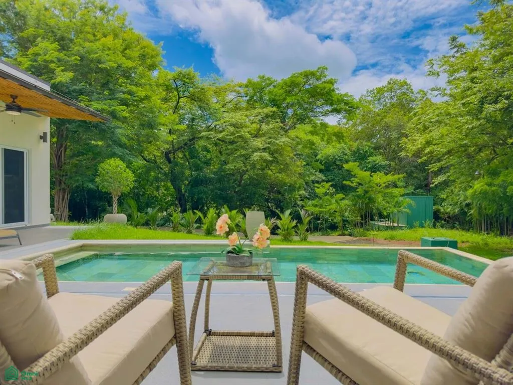 The outdoor space offers a relaxed setting surrounded by greenery, perfect for morning coffee or afternoon dips in the pool. A seasonal creek nearby attracts birds, butterflies, and the occasional curious monkey, adding to the natural charm.