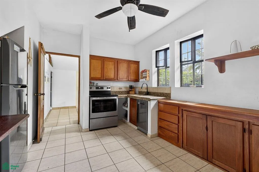 Step outside to enjoy your own private pool surrounded by lush green space and ripe fruit trees, creating a peaceful tropical retreat. The property also includes gated parking with space for both a car and a golf cart.