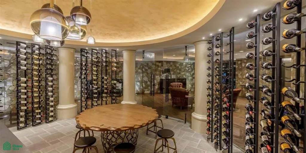 Manicured gardens and cobbled streets guide guests to The Magnum Villa Real Estate entrance, introducing round columns, imposing arches and stone detailing present throughout the property. The arched door with iron and glass detailing opens to the foyer, a triple-height area with elegant, bifurcated stairs with wood panels at their side.
