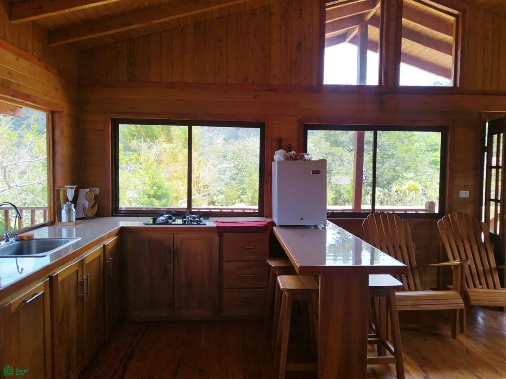 ??Áreas Sociales: Cocina, sala, comedor y baño completo con acabados rústicos.