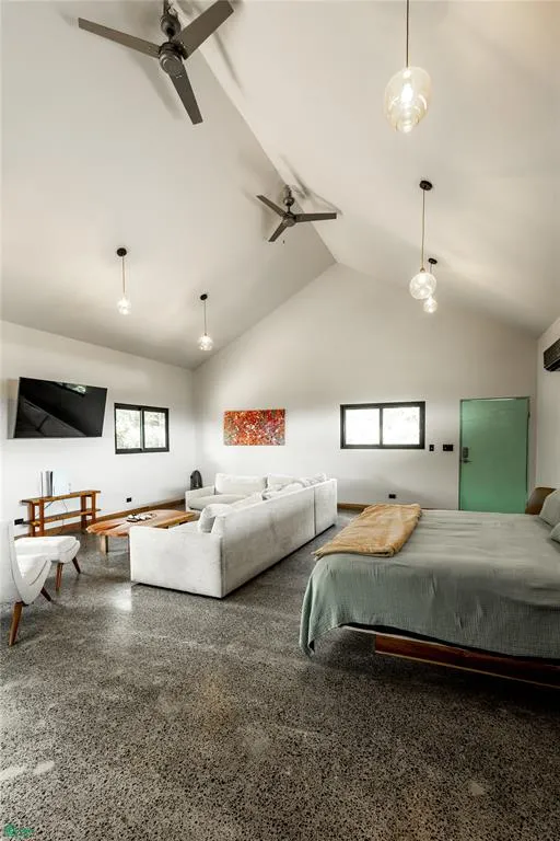 Second Floor: A complete modern apartment with open living spaces, kitchen, bedroom, and bath—designed for comfortable full-time living or guest accommodations.