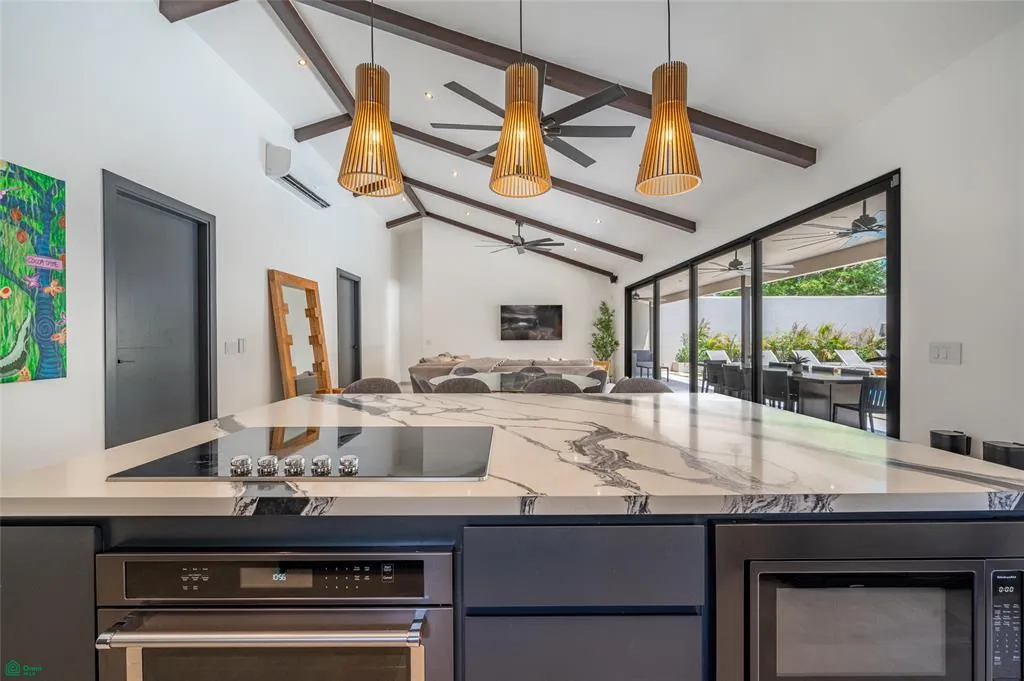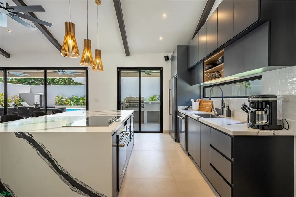 At the center of the property, the pool and lounge area serve as the focal point, surrounded by tropical landscaping, sun loungers, and multiple outdoor living spaces. A covered dining area and fully equipped outdoor kitchen with BBQ enhance the property’s entertaining potential.