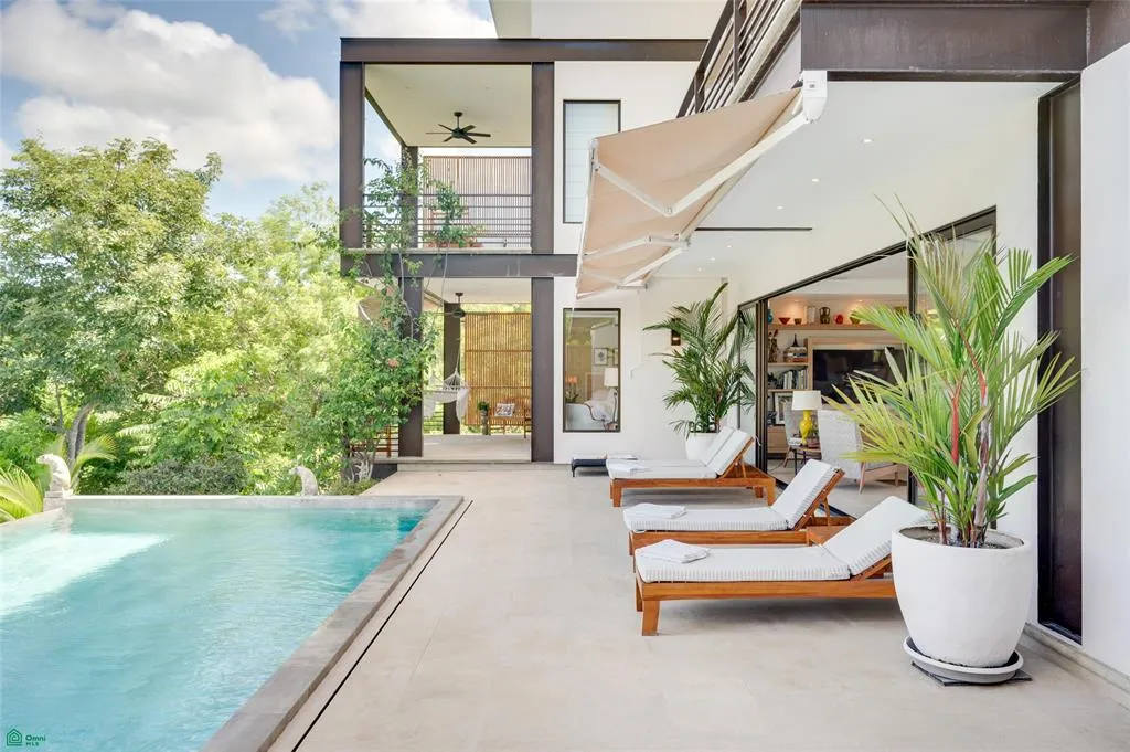 The primary suite on the main level is a private retreat of its own, opening directly onto the pool. Its en suite bath is thoughtfully designed, with a soaking tub, walk-in shower, and custom-fitted closet. A dedicated office is also located on this floor.