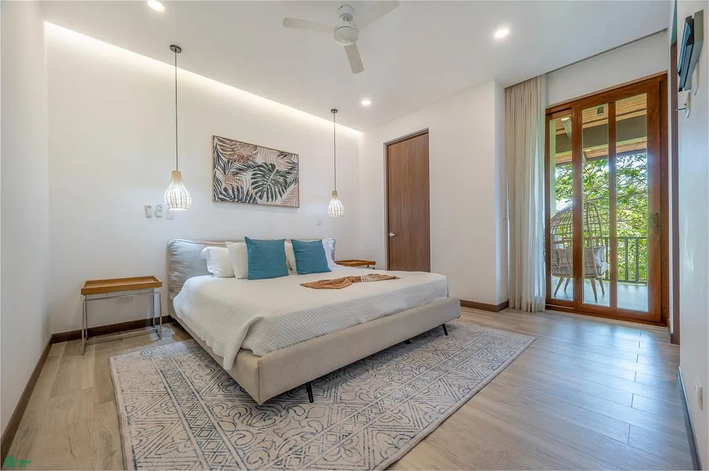 The duplex is located inside the Los Malinches community, which has a wonderful, relaxed atmosphere. You’ll find beautiful native trees, nicely kept gardens, a charming chapel, a gym, and a large lap pool for serious swimmers. There’s even a small convenience store right at the entrance. The architectural style here is inspired by the old Guanacaste farm estates, giving you a quiet, countryside feel, yet you’re only a five minute drive from Hacienda Pinilla’s pristine beaches and luxury amenities.