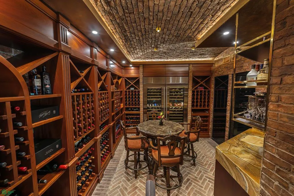 At the center of the home is a high-end chef’s kitchen equipped with professional-grade appliances, seamlessly connected to entertainment spaces including a media room with a full cinematic setup. This area extends naturally to the outdoors, where a fully equipped exterior kitchen supports large-scale entertaining.