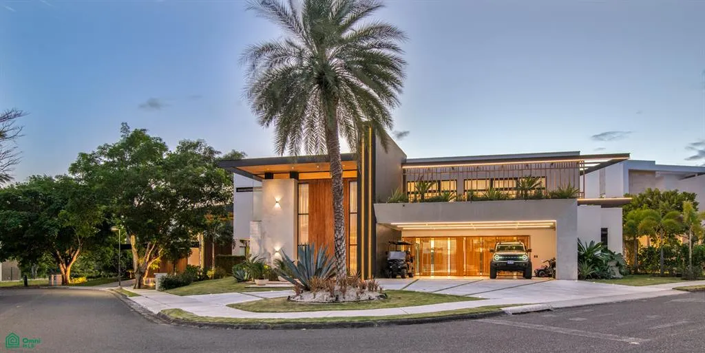 From the entrance, the home’s striking façade features a drive-thru driveway with a central palm tree and a spacious side parking area for four vehicles. A stunning six-meter-high main door leads to a double-height foyer, where elegant pendant lighting and glass railings from the second floor immediately catch the eye. The fully integrated social area combines the living room, dining area, and kitchen, all with large-format marble floors and warm teak ceilings, creating a seamless and inviting atmosphere.