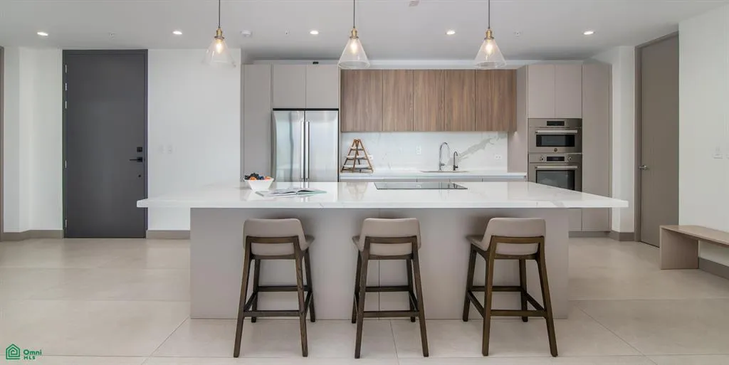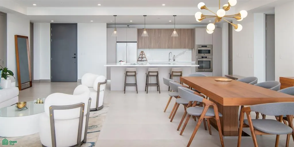 Inside, the main living area is designed as a single, expansive space where the living room, dining area, and kitchen connect naturally. Warm neutral finishes, a white marble island, and subtle wood and gold accents define the space, while full openness toward the terrace keeps the view consistently present.