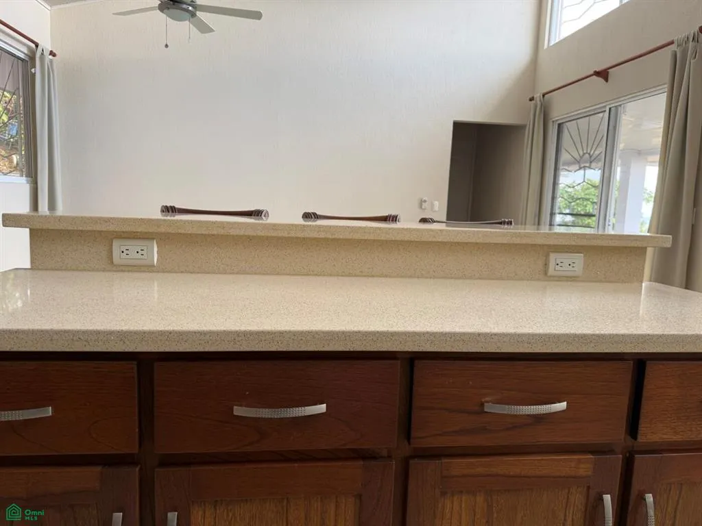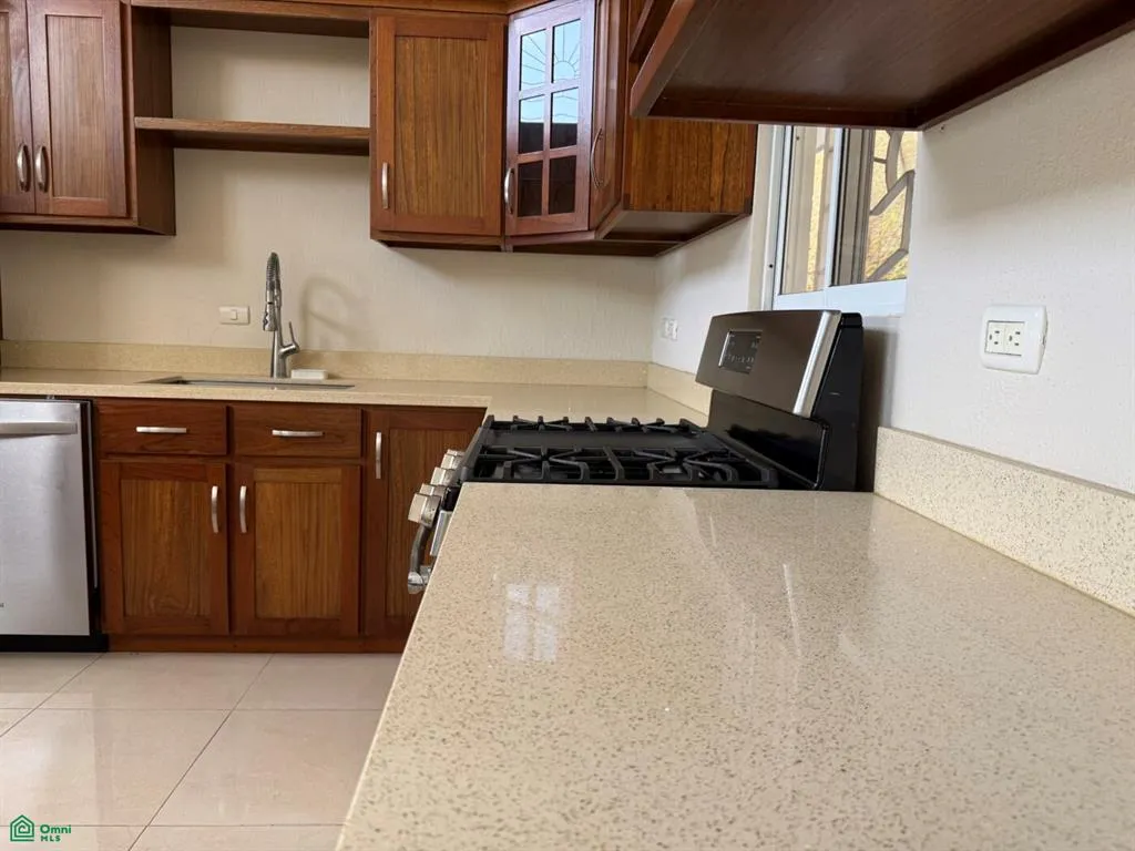 The kitchen has an open design, with a living and kitchen area. With lots of windows, this is a nice, bright area. The kitchen has hardwood cabinets and beautiful quartz countertops. There is a ton of counter space and storage in this kitchen. The elevated bar area is perfect for your guests to sit and chat with you while you are cooking.