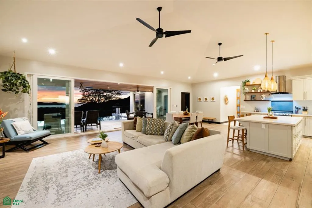 The home’s minimalistic design and vaulted ceilings create an open, welcoming atmosphere. The open-concept layout fosters a sense of togetherness, while the gourmet chef-inspired kitchen – complete with stainless steel appliances, breakfast bar, and granite countertops – flows seamlessly into the living and dining areas. The living space connects with the outdoors, with accordion glass doors providing uninterrupted views of the infinity pool and the ocean and mountains beyond.
