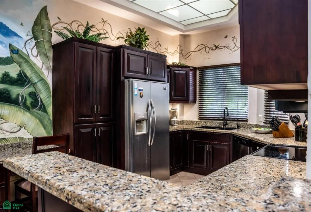 The house, which is being sold fully furnished, stands out for its artistic murals. On the ground floor, you’ll find a modern kitchen integrated with the dining room and a living room, next to an outdoor space with a barbecue area.